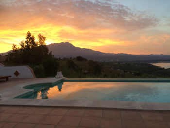 Großer Pool und große Außenbereiche mit einem mehrere verschiedene TerrassenartenEines davon ist überdacht.
