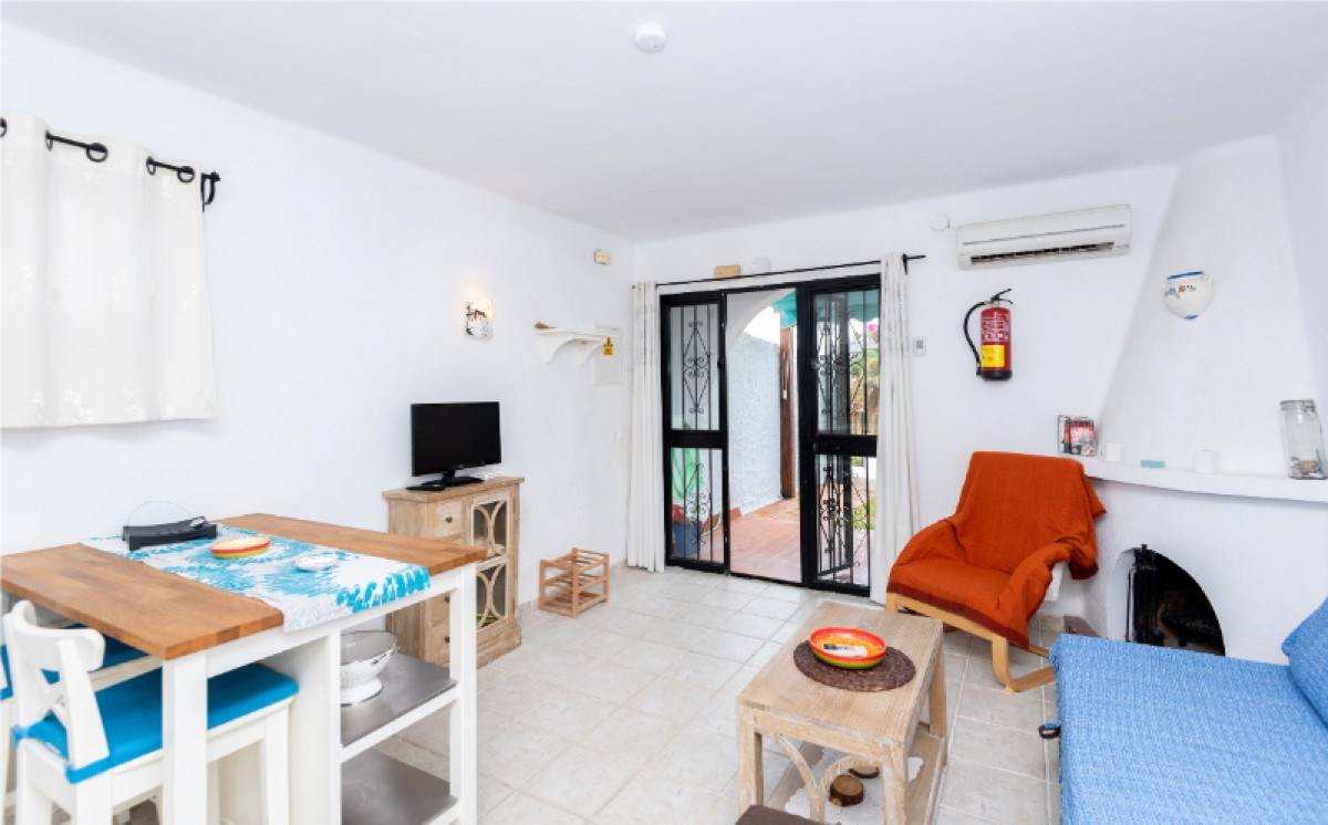 Bright and fresh apartment in the very popular area of Capistrano Village in Nerja. The property is located on the ground floor and has a large outdoor area in the form of a terrace and private green space. Open kitchen, 1 bathroom and 1 bedroom. In the area there are 2 large pool areas. Rents very well.