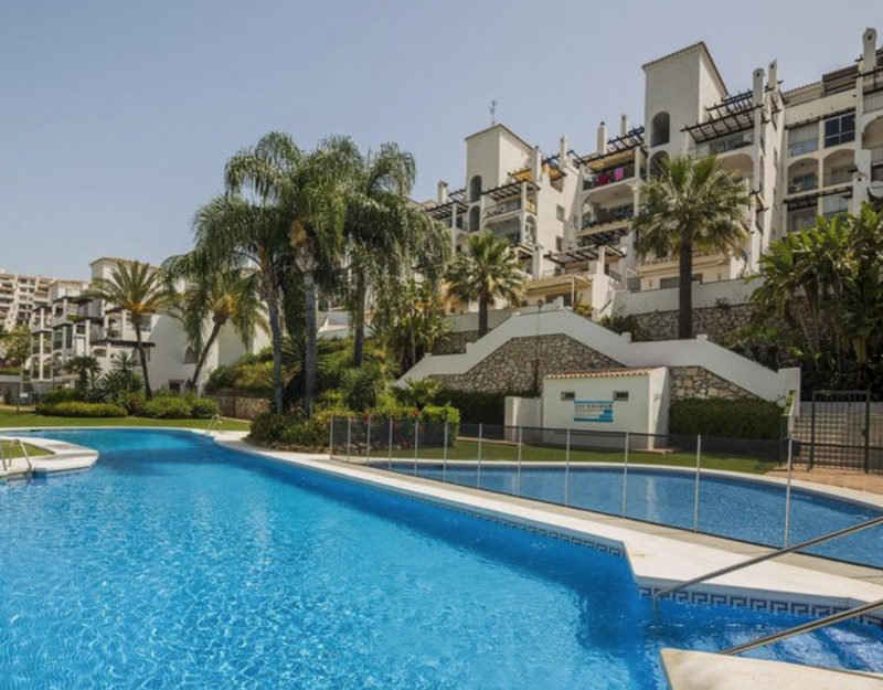 The apartment is located in the popular area of Calahonda. It is located in south facing on the second floor of a gated complex with communal gardens and communal pool .