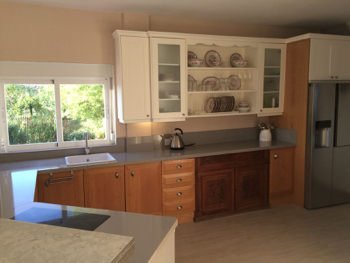 Cocina abierta, distribución abierta, salón, chimenea, grandes áreas de vidrio Con vistas a la piscina, al lago Viñuela y al hermoso paisaje.