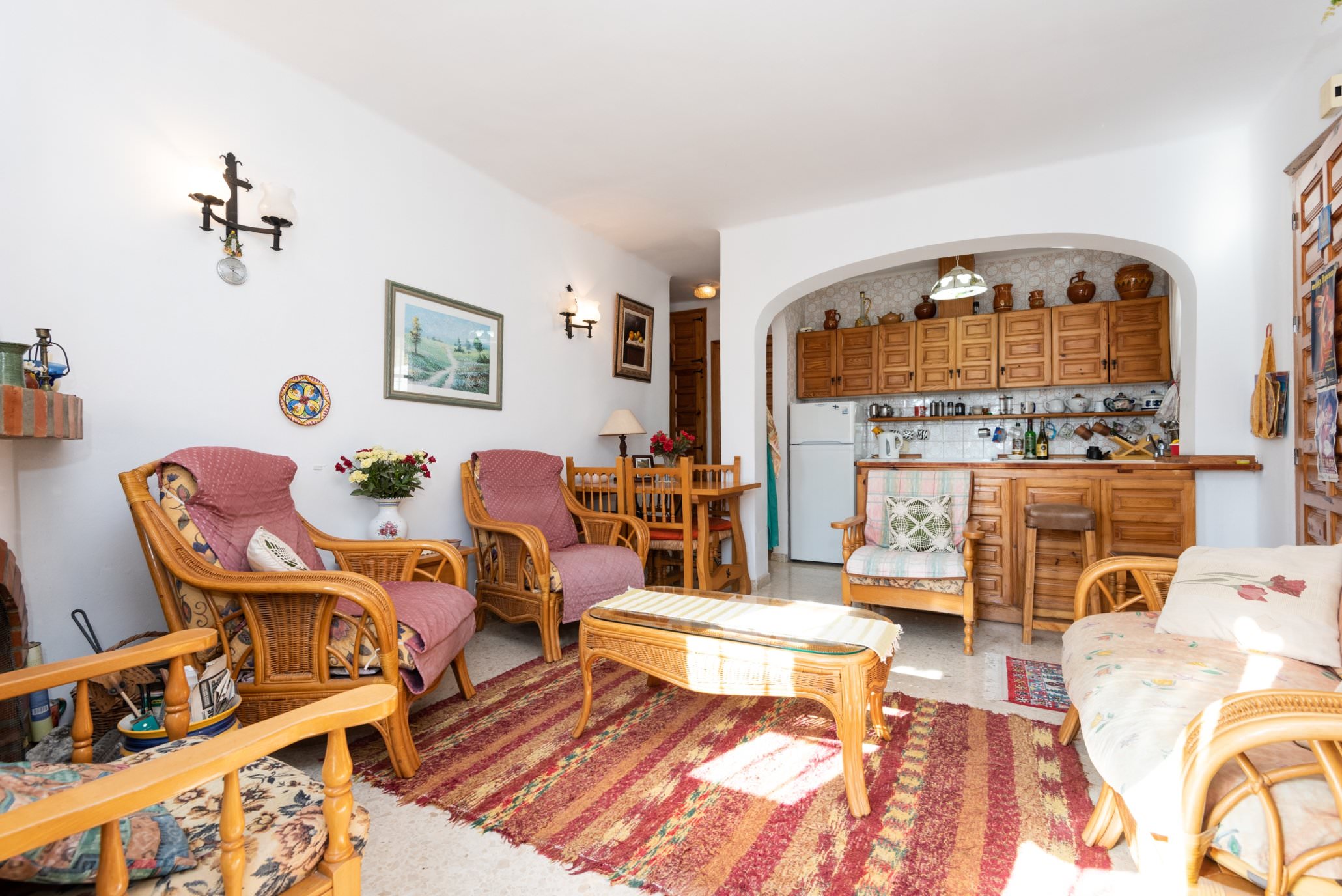 Rivitalo/Bungalow San Juan de Capistrano Nerja. Kiinteistö on kulmatalo, josta on erittäin hyvät näkymät Välimerelle. Etelään päin, aurinko paistaa suurimman osan päivästä. 2 makuuhuonetta ja 1 kylpyhuone. Suuri terassi ja pieni oma puutarha. Osa kaipaa remonttia.
