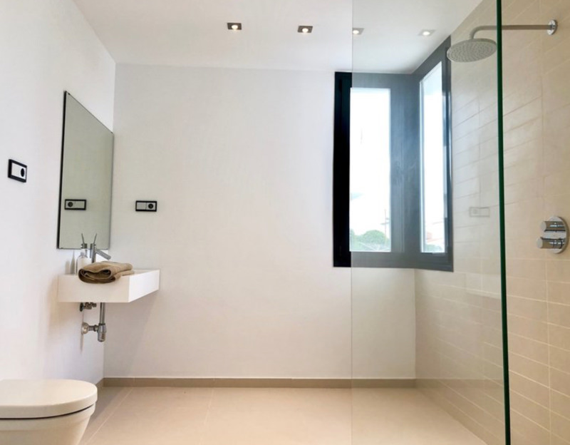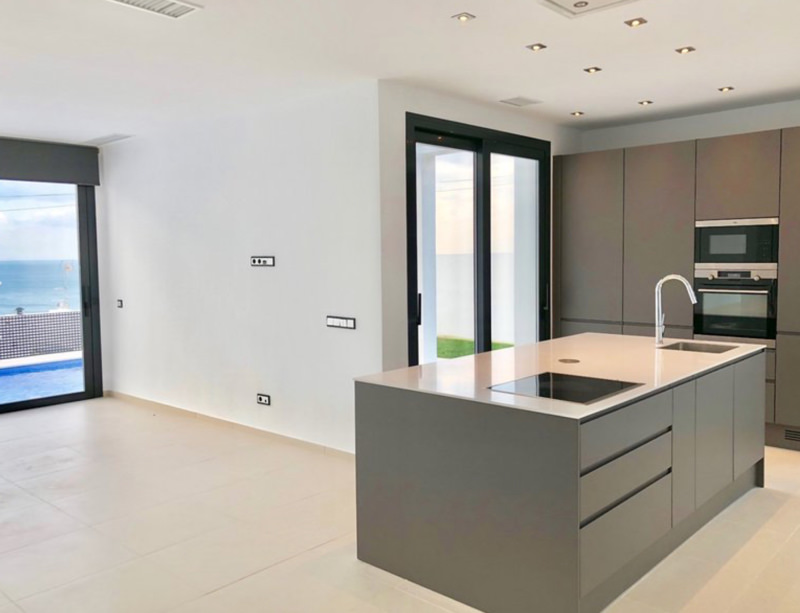 Le rez-de-chaussée comprend deux grandes chambres avec placards et une salle de bains complète avec douche double. La cuisine ouverte est de style scandinave grand îlot de cuisine au milieu, avec vue sur la mer et la piscine.