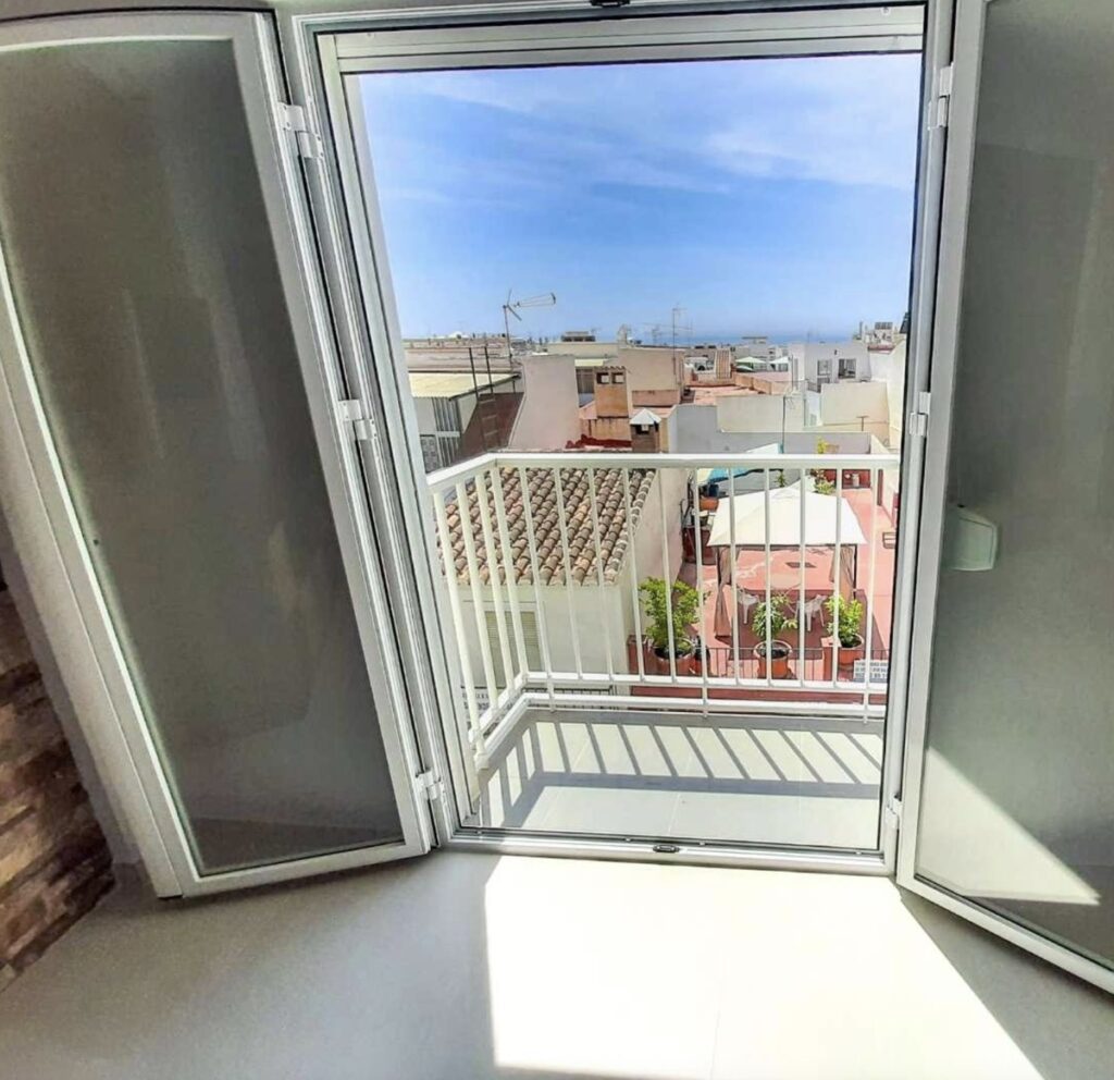 Bostaden har en modern planlösning med öppen planlösning mellan fullt utrustat kök, vardagsrum och matplats. Den ljusa och luftiga sällskapsytan har direkt utgång till en rymlig balkong/terrass med fin utsikt över Nerjas takåsar och vidare mot Medelhavet.