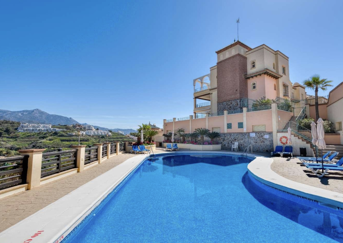 Lägenhet i den trevliga urbanisationen La Alcazaba i Tamango Hill i Torrox, precis utanför Nerja. Fastigheten har 2 sovrum och 2 badrum. Fullt utrustat kök, vardagsrum med utgång till en stor terrass med utsikt över bergen samt lite utsikt över Medelhavet. I priset ingår ett garage. Mycket trevligt pool område.