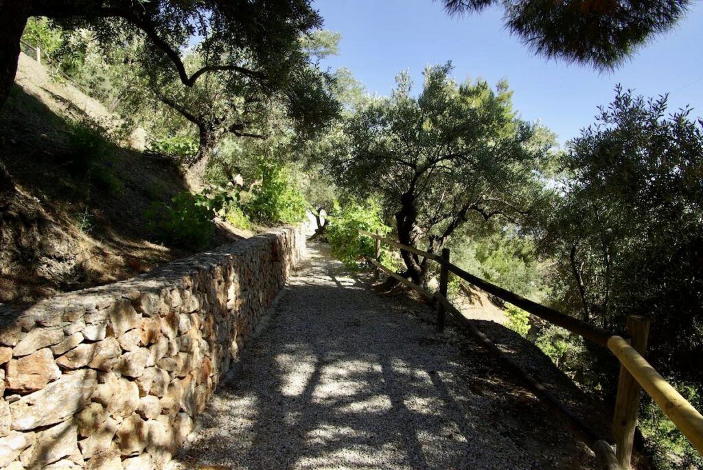 Tomten om 5 472 m² rymmer varierad växtlighet, däribland olivträd. Den privata poolen smälter fint in i omgivningen och erbjuder en idealisk plats för avkoppling med utsikt över kullar, berg och hav.