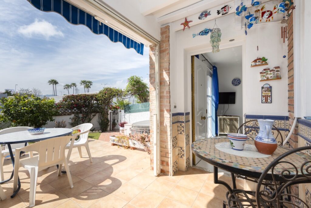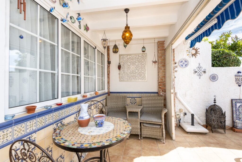 Utemiljön är genomtänkt utformad med dekorativa andalusiska kakelplattor, växter och charmiga väggdetaljer som skapar en varm och karaktärsfull atmosfär.