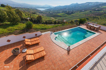 Otwarta kuchnia, otwarty salon, kominek, duże powierzchnie szklane z widok na basen, jezioro Vinuela i piękny krajobraz.
