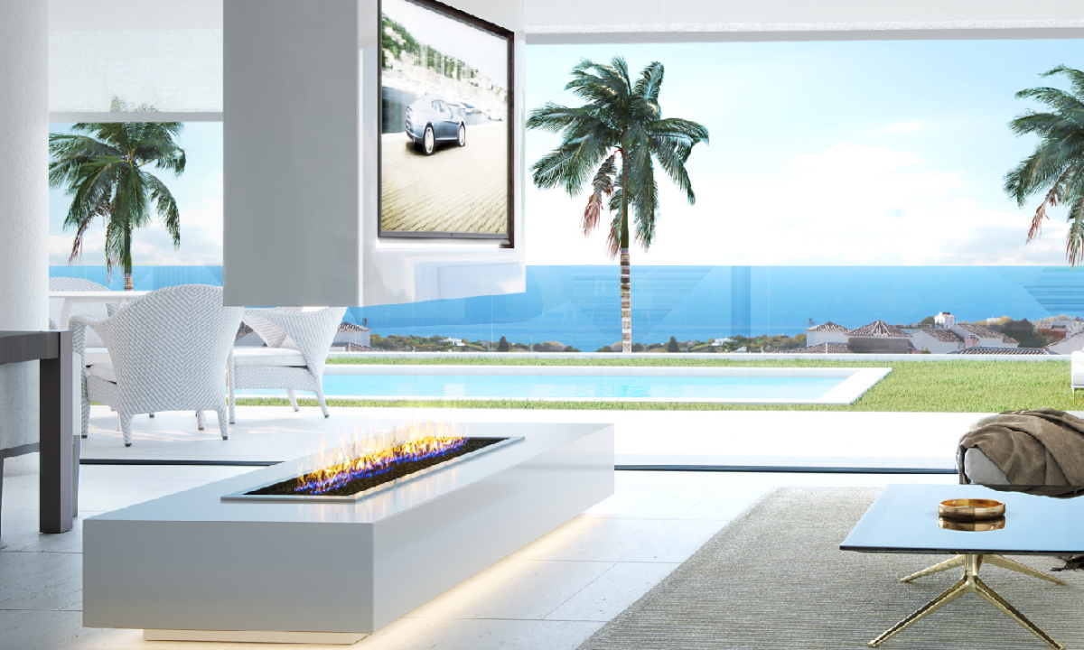 Okna to automatyczne drzwi sięgające od podłogi do sufitu, które rozciągają się wzdłuż całej południowej fasady. Roztacza się z nich wspaniały widok na Morze Śródziemne, a salon jest zalewany naturalnym światłem.