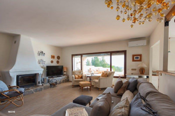 No piso inferior, o espaço se abre para uma sala de estar ampla e iluminada, com lareira e cozinha/sala de jantar integrada e totalmente equipada, com uma grande janela panorâmica. Ar-condicionado no quarto principal e na sala de estar. Dois quartos no piso inferior (com banheiros privativos adjacentes).