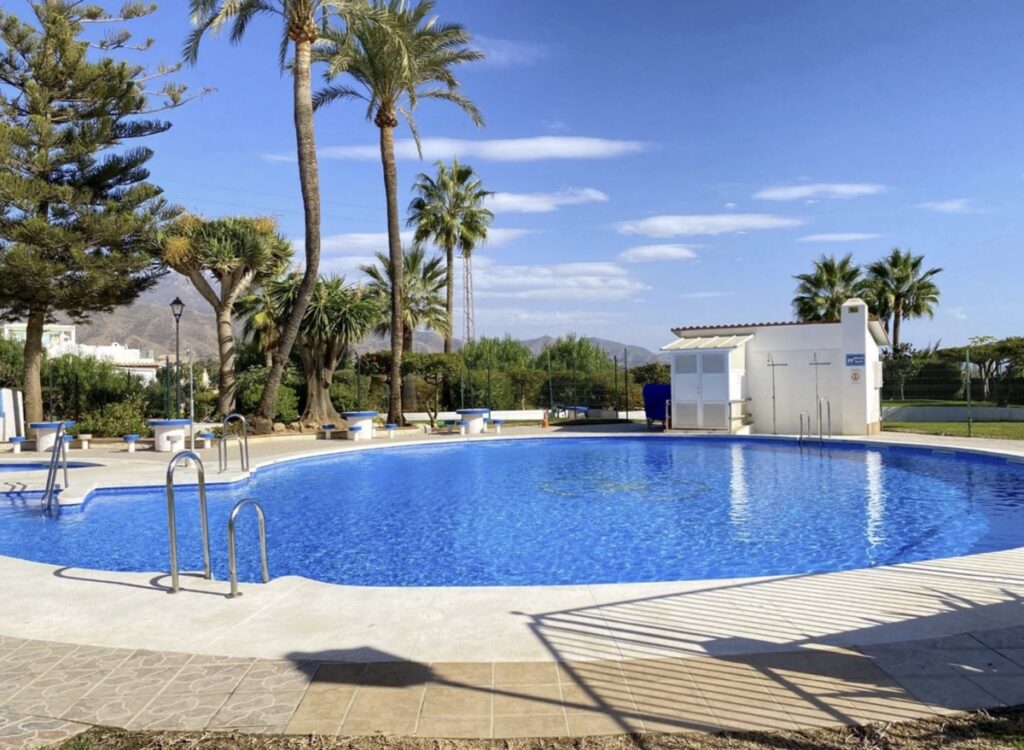 Bostaden har trevliga vyer mot hav och berg och ligger cirka 800 meter från stranden. Nerjas centrum ligger ungefär 3 km bort. I urbanisationen finns gemensam pool, trädgårdar och en restaurang på området.