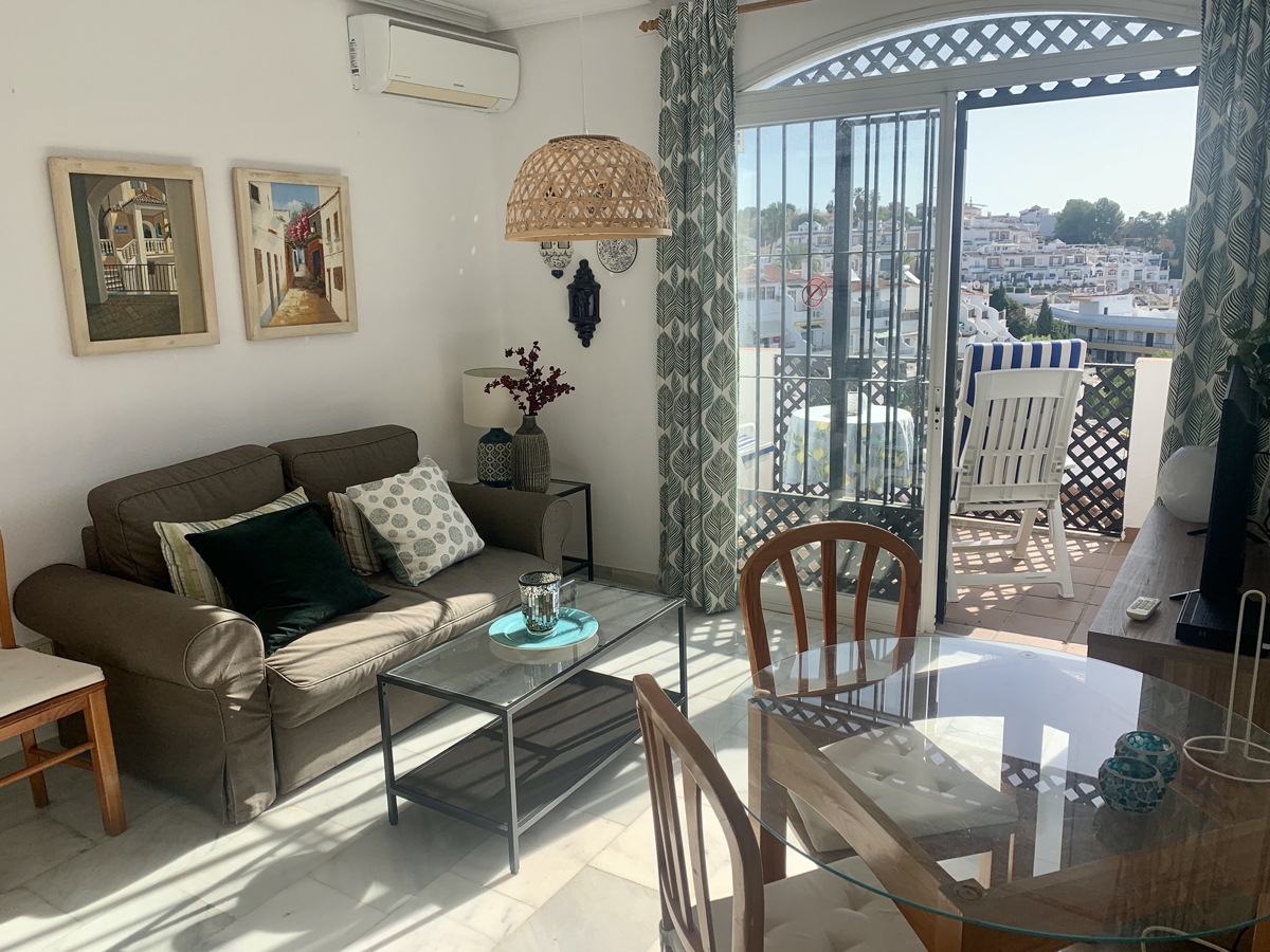 Ми щойно отримали цю дуже гарну та свіжу квартиру в популярному районі Verano Azul у Nerja. Розташована на верхньому поверсі з фантастичним видом на Середземне море та навколишні гори. У квартирі є 2 спальні, 1 ванна кімната. Відкрита кухня, що з'єднана з вітальнею. Кондиціонер з підігрівом та охолодженням. Гарна тераса з великою кількістю сонця та величезним видом.
